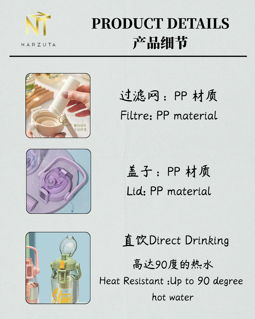 Body: TRITAN material, BPA Free(杯身材质:TRITAN 材质,不含双酚A)