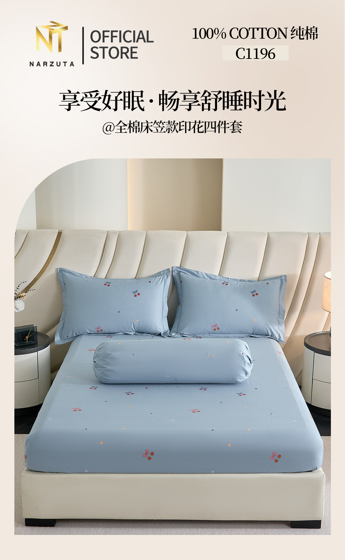 King 4in1 included: Fitted Sheet 183*192*43cm + 2 Pillow Cases + 1 Bolster Case