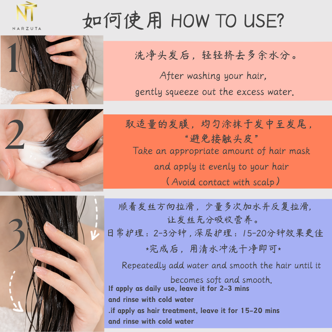 2) Take an appropriate amount of hair mask and apply it evenly to your hair (Avoid contact with scalp)