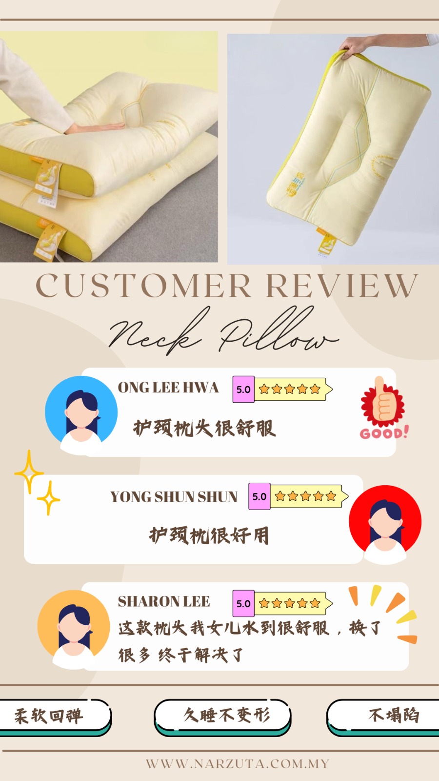 NECK PILLOW YELLOW 48*74CM 黄色护颈枕头 Zipper closure.(拉链式设计) Cotton fabric for outer cover.(外层面料为纯棉材质) Filling not easily leaks out.(不容易钻棉) Polyster filling.(主要填充物为弹力棉) GOOD REVIEWS  ...Read more
