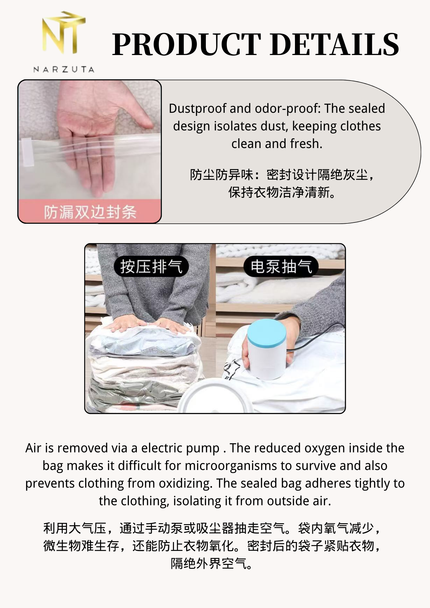 Air is removed via a electric pump . The reduced oxygen inside the bag makes it difficult for microorganisms to survive and also prevents clothing from oxidizing. The sealed bag adheres tightly to the clothing, isolating it from outside air.
